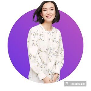 A classic button-front shirt with a floral twist. Pleated trim adds even more feminine flair to the look. Very fresh material and lightweight. Unlined.