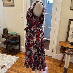 Talbot’s elegant sleeveless dress features a vibrant floral pattern in red and blue. Tie at waist. Fully lined. Size 6.