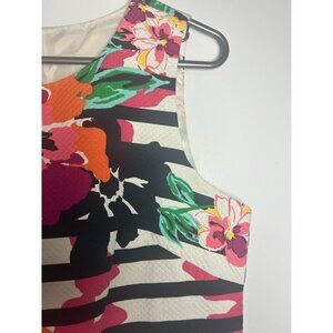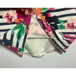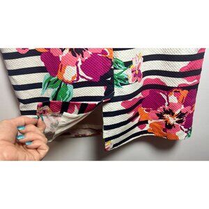 This Talbots sheath dress in size 10 features bold floral prints over classic navy-and-white stripes. Designed with a structured, non-stretch cotton fabric, it has a textured finish, full lining, and a flattering midi length. The dress includes a back zipper closure and a small slit at the hem for ease of movement.