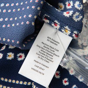 New with tags Talbots short sleeve blouse in a flattering floral stripe print. Blue base with vertical white stripes, detailed with red and yellow floral accents. Made from a soft, stretchy poly-spandex blend that resists wrinkles and drapes beautifully.