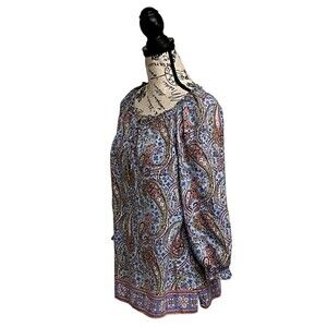 This Talbots top features a charming paisley pattern in blue and multi-colors, perfect for a boho-inspired outfit. The tie neck and 3/4 length sleeves with elastic details provide a comfortable fit for a classic style blouse. The top is made of rayon material and has a tie closure, making it easy to wear and pair with any bottom.