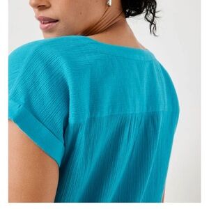 Easy, short sleeve popover top in an airy crinkle texture. Casual chic with a sleek split neck, extended shoulder seams and a curved shirttail hem.