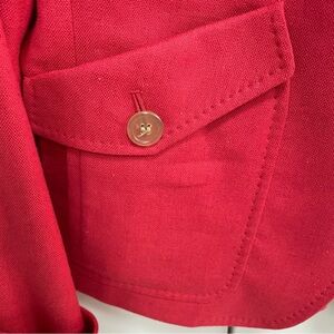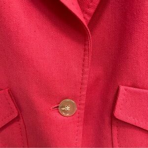 The blazer is a bright coral color and features a classic design with flap pockets and button closures. It's made of linen, making it a great choice for warm weather. The Talbots brand is known for its classic and sophisticated styles. This blazer could be styled in many ways. It can be dressed up with wide-leg pants for a chic look or worn casually with jeans.