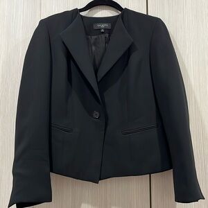 Polished perfection—Talbots Grace Fit blazer in classic black crepe stretch. Fully lined with a sharp one-button front, split cuffs, and two front slip pockets (still sewn shut).