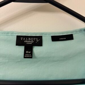 This stylish green blouse from Talbots showcases a classic button-down design with a charming ruffled bib collar. Its elegant style makes it a versatile choice for both business casual and everyday wear.