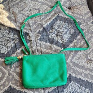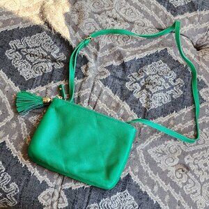 Vibrant green crossbody bag with tassel detail. Perfect for casual outings. Features a sleek design. Great color and in excellent condition. Not used since purchased.