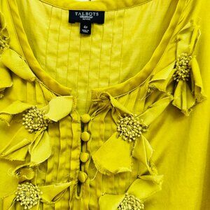 Talbot's light celery green shell top. Perfect for under a suit jacket or alone. Sleeveless with floral appliqués and four silk covered buttons down the front. 58% silk, 42" cotton. Women's size 4 petite. In good gently used condition.