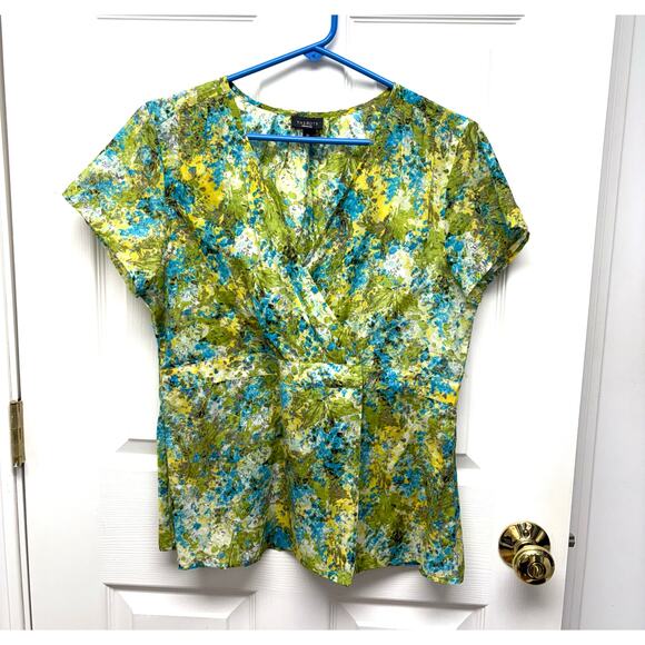 Talbots Green and Blue Floral Faux Wrap Blouse, Short Sleeves, Women's Size 10