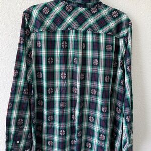 This stylish button-down shirt from Talbots showcases a striking plaid pattern in green and blue, offering a fresh and vibrant look. Crafted from a soft cotton blend, it ensures comfort and ease for any casual outing. Its classic design makes it a versatile addition to your wardrobe.