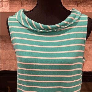 This casual sheath dress from Talbots features a sleeveless design with a chic cowl neckline, perfect for relaxed outings. The green and white color palette adds a fresh touch, while the midi length offers a versatile and stylish look. Under the arm width 19 in Length 37 3/4 in