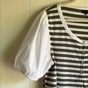 Talbots Green and White Striped Mixed Media Puff Sleeve Henley Blouse Sz XL