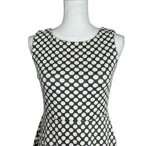 Talbots, Grey & Cream brocade polka dot patter, crewe neck, sleeveless silhouette, hidden zipper, fitted through the chest and waist, full skirt hits at or above the knee. No rips, stains or pulls.