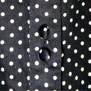 This collared top is black with cream polka dots. The row of buttons is done in pairs of two fabric covered buttons at each spot. There are cuffed short sleeves with a fabric covered button closure on the back of the sleeves. It has a tailored fit with a rounded hemline. The fabric is a stretch cotton sateen with good body and a little sheen. In very good condition. The content/care tag is missing.
