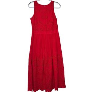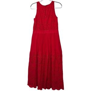 Talbots, red dress, maxi dress, eyelet dress, embroidered dress, sleeveless dress, tiered dress, summer dress, cocktail dress, party dress, womens dress, size 8, classic style, feminine dress, vacation dress