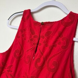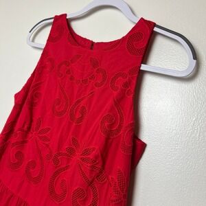 A vibrant red maxi dress featuring intricate eyelet embroidery throughout. This sleeveless dress has a flattering round neckline and a tiered skirt that adds movement and dimension. The dress is fully lined and has a concealed back zipper closure with a hook and eye. Perfect for a summer garden party, a casual brunch, or a romantic evening out.