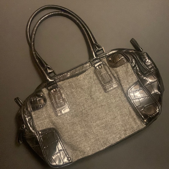 Talbots handbag 13” L . 9” H . 6” W alligator like black patent leather material with gray fabric adorn this whole bag. Two areas to fill along with small zipper and open pocket. Zipper closure as well bin 2