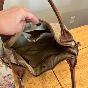 Excellent used condition. No stains. Nylon, quilted fabric with brown leather shoulder straps. Slight wear on bottom.
