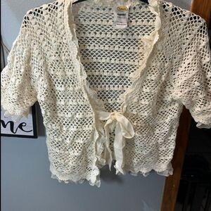 Talbots Handknit Tie Front Crop Short Sleeve Sweater Size Medium Cream White