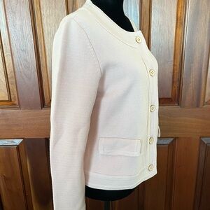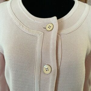 This is a beautiful and heavier weight cardigan/jacket. Sweater blazer. Very Jackie O, Chanel vibes.