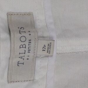 Talbots Heritage Petite Women's White Linen Blend High Rise Flat Front Two Hook Zipper Front Closure Straight Leg Casual Pants. 53% Linen, 47% Cotton. Marks Per Photos. Measurements approx. Flat Lay. Waist: 16, Rise: 11, Hips: 21, Inseam: 28, Hem Opening: 9.5". Size 12P Color May Vary Due To Lighting.