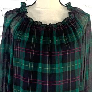 Talbots Holiday Blouse Green Blue Plaid Sheer Sleeve Pull On Style Top Sz MP