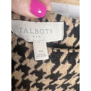 Elevate your wardrobe with this chic Talbots skirt. The houndstooth pattern in black and beige is perfect for any occasion, whether it be a casual day out or a formal wedding. The skirt is made of a polyester and wool blend and is lined for added comfort. It features a zip closure and has a straight and pencil style that will flatter any body type.