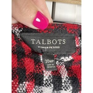 The Talbots Houndstooth Wool Blend Tweed Skirt in size 20P is a preppy and academic-inspired piece perfect for the holiday season. Made from a blend of polyester, viscose, and wool, this knee-length skirt features a classic plaid pattern in red, white, and black colors. The skirt closes with a zip and is lined for added comfort. Ideal for various occasions such as travel, weddings, parties, casual outings, workwear, and business events, this Talbots skirt is a stylish and versatile addition to any woman's wardrobe.