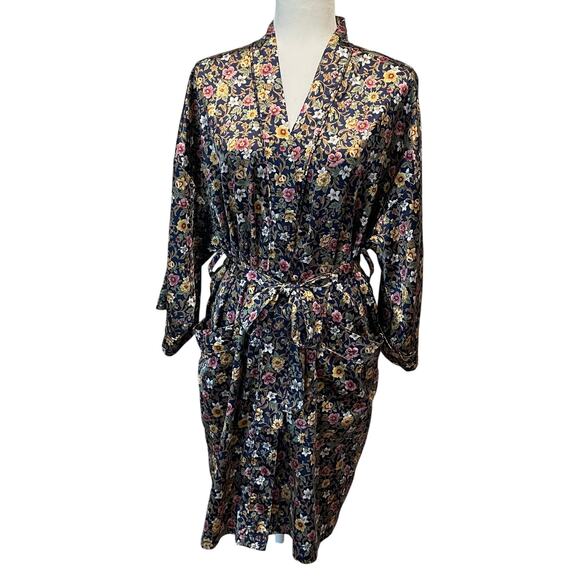 Talbots Intimates Satin Kimono Floral Robe Pockets Sash Belt Sz S Classic Travel