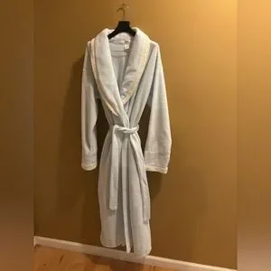 Soft blue robe with a cozy feel. Features a classic design and comfortable fit.