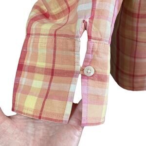 Talbots Irish Linen Blend Orange Pink Yellow Plaid Button Down Shirt Sz Large. 53% linen, 47% cotton. Sleeves have a wide cuff that can be work folded down.