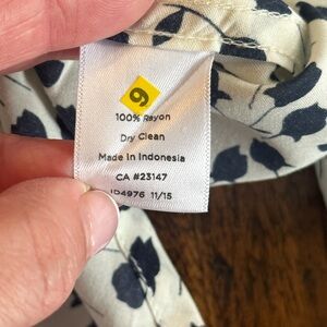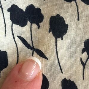 Preowned condition. There is a very faint small stain and another stain on the fabric under the button area. Shown in last photos and not noticeable. Cute dainty black flowers and an ivory background. Sleeve can be worn down or rolled up.