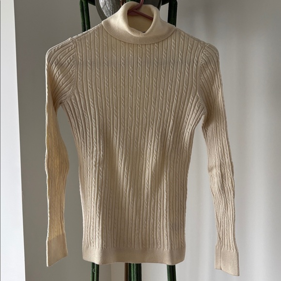 Stay cozy and stylish with this cream turtleneck cable knit sweater. Perfect for layering in cooler weather. Was a gift, too small. NEVER WORN