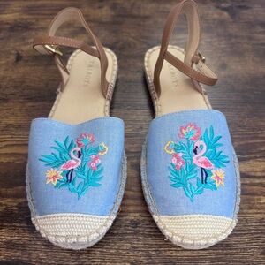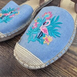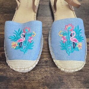 talbots izzy sandals, embroidered espadrilles, d’orsay espadrille shoes, chambray wedge sandals, flamingo embroidered shoes, summer espadrille flats, women’s espadrille sandals, coastal style sandals, lightweight wedge shoes, casual vacation sandals, feminine ankle strap sandals, memory foam footbed sandals, resort style shoes, floral stitched sandals, chambray summer shoes, size 7.5 espadrilles, spring wedge sandals, open side d’orsay shoes, comfy stylish sandals