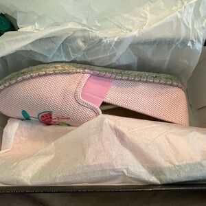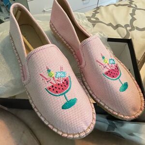 Talbots Izzy Embroidered Pink and White Canvas Espadrilles. They have amazing Flat Comfort, enhanced with a Memory Foam Footbed and an Elastic Stretch Panel. Made from Canvas with a Cute Watermelon Margarita Drink Glass Embroidery. Perfect for your Summer Picnic, Barbecue or Vacation!