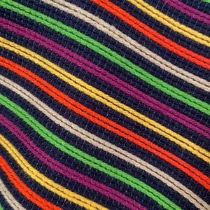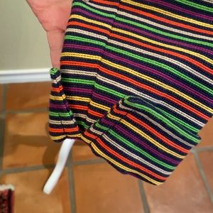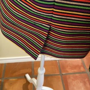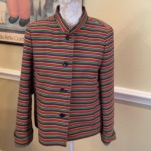Multicolor jacket, standup collar, boxy shape. Cute turned back cuffs and back vents. Very versatile, year round piece. Can be worn casually, or with skirt or slacks for the office.