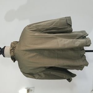 Nice olive green. No size in it so please see measurements. I would think an extra large. Great shape ruffled front bottom and neck 3/4 sleeves and has pockets.