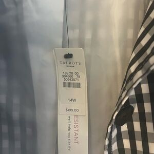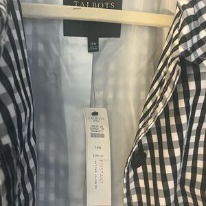 Elevate your wardrobe with this stylish black and white checkered water resistant jacket from Talbots. Perfect for any occasion, this lightweight jacket combines classic design with modern flair. Perfect for spring! Never worn, but please note the small stain on the inside as shown in the last picture.