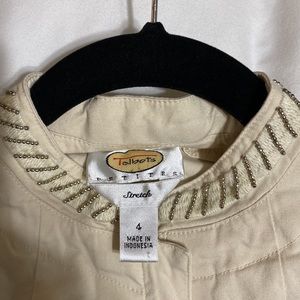 Talbots petite stretch size for jacket. Good gently used condition. There is a small spot on the sleeve that I haven’t tried to treat. Smoke free home.