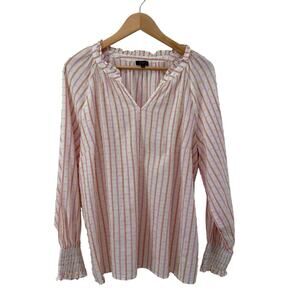 Talbots Jacquard Stripe Smocked Cuff Swiss Dot Blouse Size L Pink Yellow Cottage