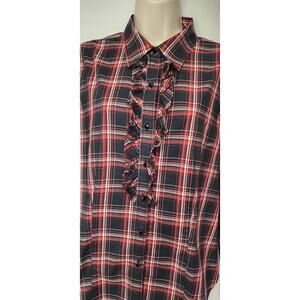 Talbots Jewel Button Front Red/Black Plaid Ruffle Front Long Sleeve Size 12