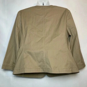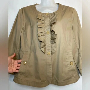 Talbots Khaki Jacket Blazer Tan Ruffle Trim 3 Button 3/4 Sleeve Size 10