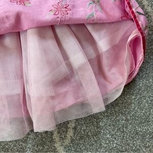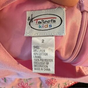 Absolutely adorable little cotton and linen blend sleeveless dress from Talbots Kids! The pink fabric has pretty floral embroidery at the bottom, an a-line shape, and a tulle underskirt for volume. In excellent condition. The only sign of wear is a number 4 written on the tag. Other than that it has no stains or holes. Girls Size 2.