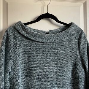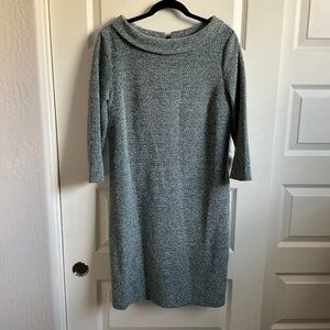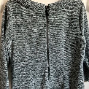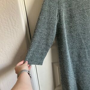 So pretty! Talbots knit tweed sweater dress. The sleeves are elbow length. Pretty green/teal/black colors. Exposed zipper on the back.