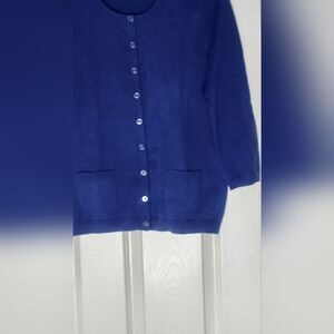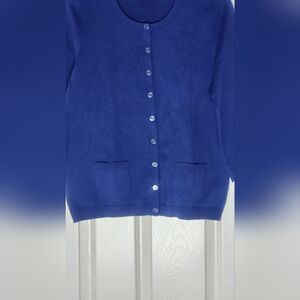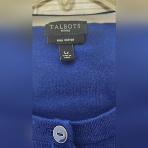This Talbots cardigan in a rich blue hue is a versatile addition to any wardrobe. Crafted with a classic design, it features a comfortable knit pattern and a traditional crew neckline. Ideal for layering, this sweater offers both warmth and style.