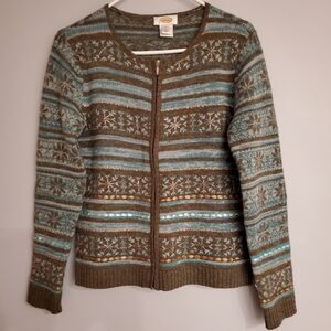 Talbots Lambswool Fair Isle Snowflake Embellished Full Zip Cardigan Size S