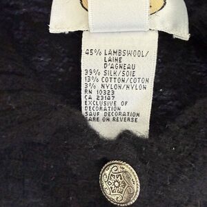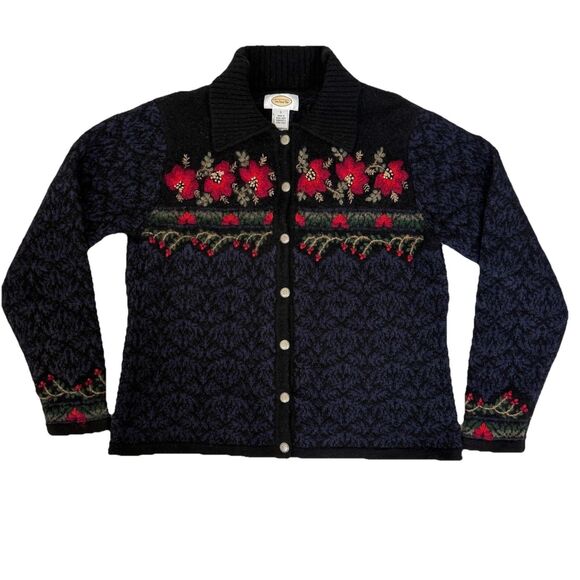 Gorgeous vintage Talbots lambswool/silk blend cardigan with richly embroidered red floral details. Made in Hong Kong, known for Talbots’ premium early knitwear quality. Features a textured knit body, ornate silver-tone buttons, and a ribbed fold-over collar.
