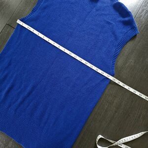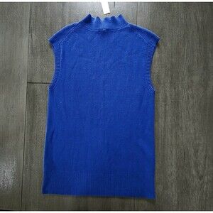 The Talbots Large Royal Blue Cotton Blend Knit Sweater is a stylish and versatile sleeveless top perfect for various occasions. Made from a comfortable cotton and modal blend with a ribbed knit fabric type, this mock neck sweater features a solid pattern in a beautiful blue color. Great to pair with cardigan or under blazer. Knit is medium thickness. See pictures for measurements