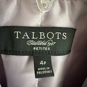 Perfect for any occasion, this jacket is ideal for spring. It comes in a beautiful lavender color and is designed for women size 4P. This Talbots Lavender blazer is a must-have for any wardrobe, whether you're headed to work or just running errands.