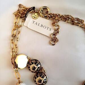 The necklace is a layered two-strand piece featuring wrapped enameled beads. It has a high-end design, from Talbots, and showcases a mix of textures and colors that create an elegant yet versatile look. The layered strands add depth, making it perfect for styling with various outfits.