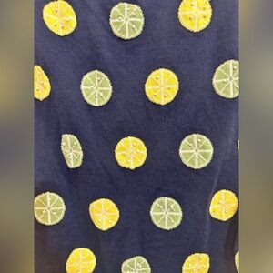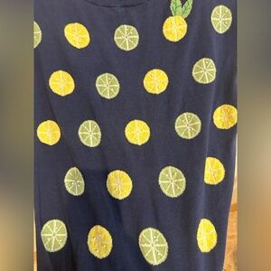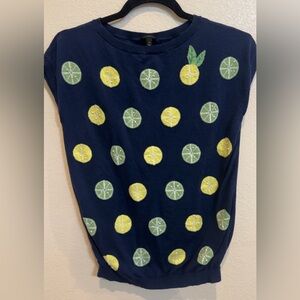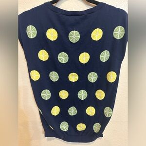 This vibrant Talbots vest features a playful lemon and lime print perfect for adding a touch of tropical flair to your wardrobe. This top has a comfortable fit which makes it an ideal choice for casual outings or relaxed summer days. Perfect for layering or just wearing it as is. Great addition to your summer wardrobe. No flaws.